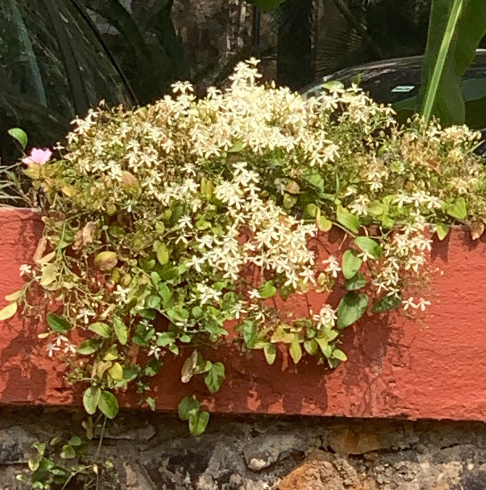 Yet Flower Power is in full bloom in our garden. Thanks to the member in charge of the garden, ours is one of the few high rise societies in Mumbai that actually has a garden. And everyday as I get into my car , I am assailed by the fragrance of Sweet Clematis. It’s amazing how these tiny almost insignificant looking flowers can set off such a strong and cloying smell! But I’m not grumbling .