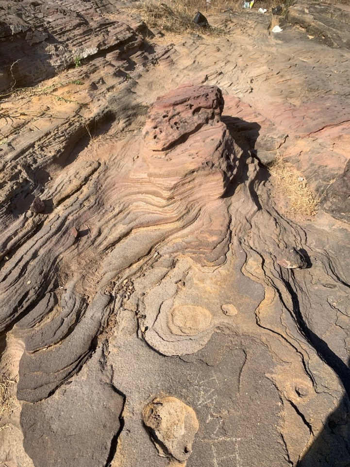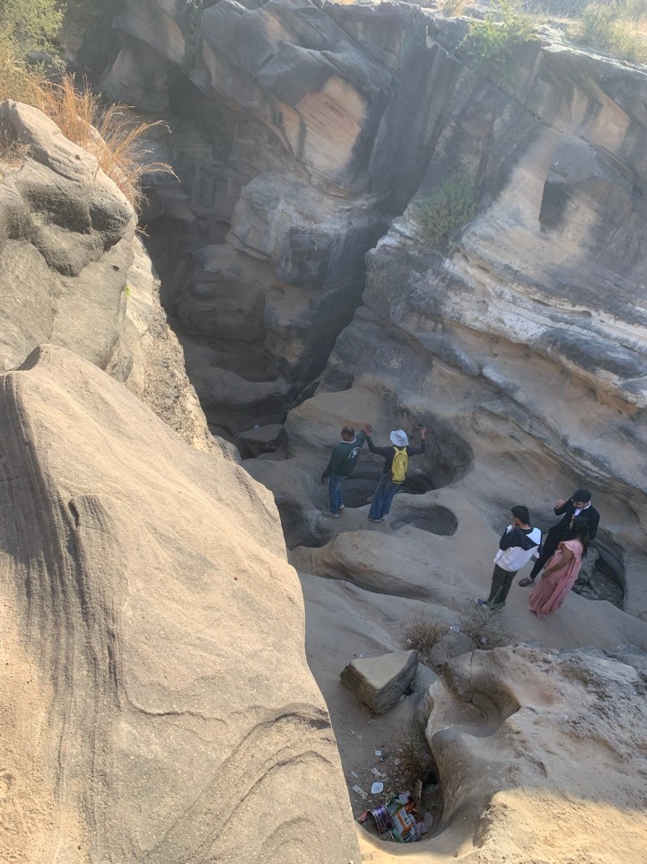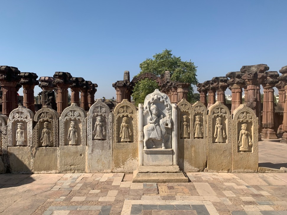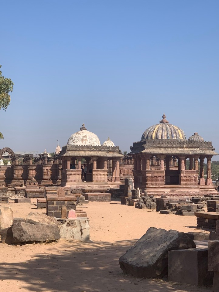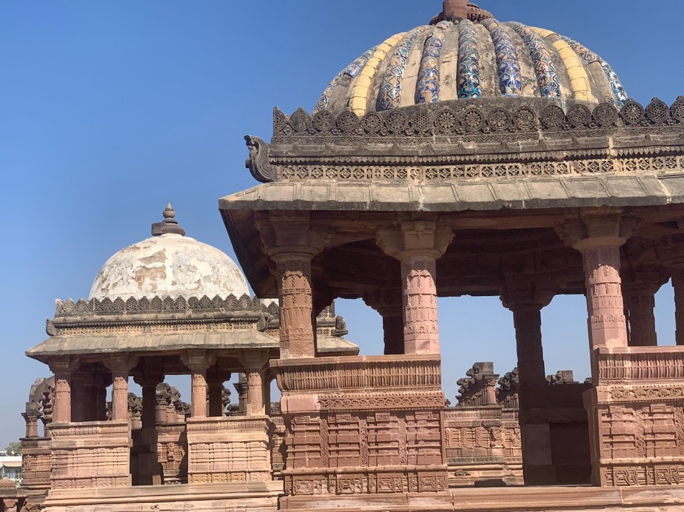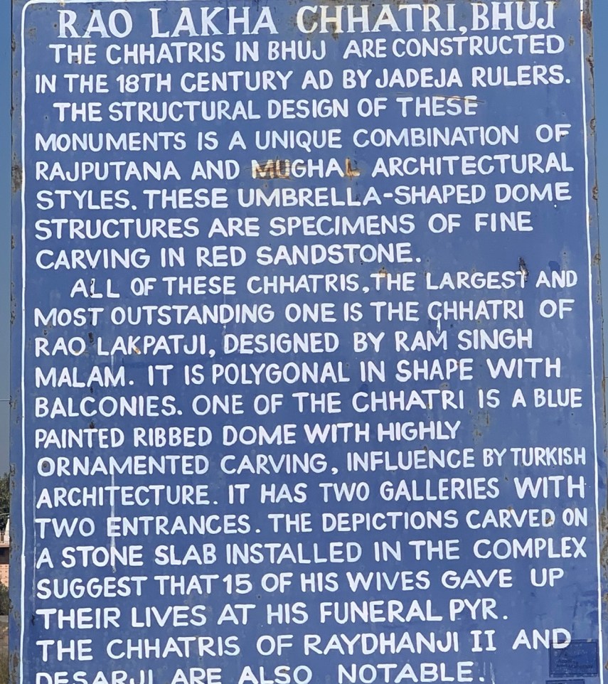 3 km to the North East of Bhuj is the Khari Nadi gorge. This deep ravine created by water erosion thousands of years ago is worth a visit for it stunning rock formations The different layers of rock exposed by the erosion due to water . The gorge is easily accessible on foot but we were scared to start our journey with a fall or sprained ankle .It was cold even at mid day there was a nip in the air but it didn’t deter these two lovebirds from having a shoot down in the ravine. Our next stop was the maharaja chattardi, a park that has memorials built for the rajas of yore . This beautifully domed memorial with mosaic is one of the few left undamaged by the earthquake The memorial to king Lakhpat with his 15 wives who committed satee on his funeral pyre which took place a few metres away . A close up of the dome Despite its rich heritage the historical information is badly collated as can be seen from this signboard The remaining columns and beautifully carved plinth of the red sandstone chattardi of raja LakhpatAnother beautiful cenotaph damaged by the earthquake of 2001A water body alongside the Chattardi makes Bhuj a birder’s delight Hotel Hill View Resort is a well appointed hotel with a warm hospitable staff that even packed a breakfast for us before our flight back home ! Resuming our tour, we went to the city Museum that was formerly a prestigious Alfred High School However, we found the museum was shut on Wednesday so we sipped some cool coconut naturally chilled water on a cart across the road . Our next stop was a very disappointingly dirty and pretty unimpressive step well – Ram kund that was nearby the museum. We then went to the largest palace called Prag Mahal . It is situated in the same complex as the old Palace ( Aina mahal) and made in the Gothic style familiar to colonial IndiaThe magnificent Darbar Hall with its stained glass windows and Belgian chandeliers The Clock Tower is a replica of London’s Big Ben