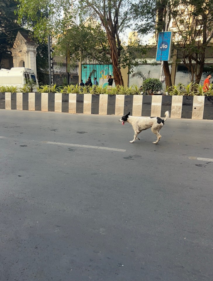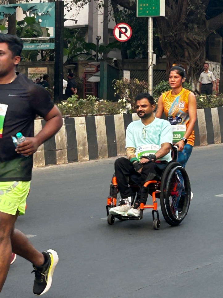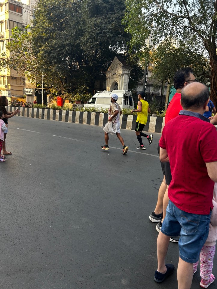 But all the runners except those really focused winners , perked up when they saw our enthusiastic support for them. Some of them smiled back in appreciation, some raised slogans for Shri Ram , the country and even our beloved God Ganesha who visits Mumbai every year. There was one pretty lady who broke into a jig while another participant dressed as a clown high fived the kids along the way . This time I found two ladies running with nine yard saris draped on their tights – paying hommage to the native women of Mumbai while two men ran with dhotis! One brave participant was wheeled in a wheelchair. And of course there was the occasional dog as well .