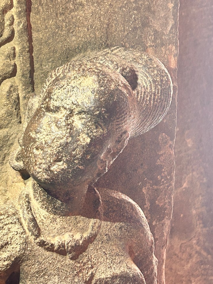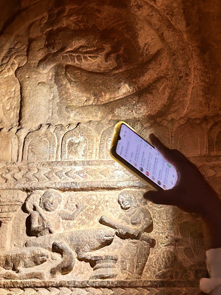 A partially hidden victory pillar that still needs to be excavated reveals the triumphant king marching on his elephant, surrounded by attendants. The second photo reveals a king lying in a relaxed pose while the last shows a flower representing peace and victory